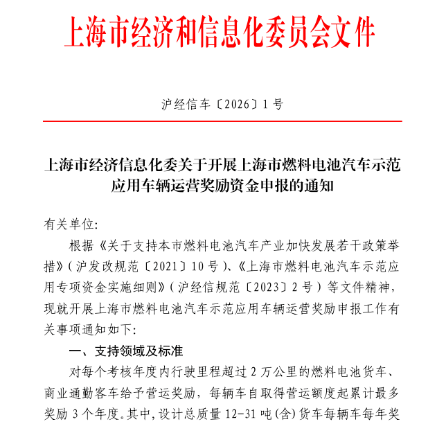 2026.1.9 每日一氢 氢讯速递 氢潮涌动,信息先行。欢迎收看本期【氢讯速递】。 一、最多奖励3个年度!上海氢车示范应用车辆运营奖励资金申报启动 2026年1月4日,上海市经济和信息化委员会开展上海市燃料电池汽车示范应用车辆运营奖励资金申报。对每个考核年度内行驶里程超过2万公里的燃料电池货车、商业通勤客车给予营运奖励,每辆车自取得营运额度起累计最多奖励3个年度。 ![]() (图:上海人民政府官网) 二、我国首款"氢能+固态电池"混动无人机成功首飞 2025年12月29日,天云氢创联合深圳北理工莫斯科大学氢氨能源动力与材料团队共同研发的氢能+固态电池混动无人机,在工信部领导等嘉宾见证下圆满完成首次飞行。此次首飞不仅标志着我国在低空动力领域实现“氢能+固态电池”混动技术的突破性落地,更奏响了产学研深度融合、共筑绿色低空经济的新篇章。 ![]() (图:天云氢创公众号) 三、国家发改委:长株潭推进绿氢“制储输用”全链条发展和应用 国家发展改革委近日印发《长株潭生态绿心加快绿色转型发展实施方案》,提出推动绿色能源综合利用,推进绿氢“制储输用”全链条发展和应用,加快新型电力系统建设,推进清洁能源替代,推动长株潭生态绿心加快绿色转型发展。 ![]() (图:中华人民共和国国家发展和改革委员会官网) 四、华中地区首个地下分布式储氢装置研发应用示范基地项目开工 2025年12月28日,华中首个地下分布式储氢装置研发应用示范基地项目在武汉开工。该项目由中冶武勘牵头,攻克材料密封等“卡脖子”技术,创新“成果转化与研发试验双轨并行”模式,将构建“制-储-加-用”闭环体系,是氢能“产学研用”深度融合与培育新质生产力的重要实践。 ![]() (图:中国冶金报社公众号) 五、首次!稀土固态储氢完成吨级钕铁硼氢碎氢回收工业示范 近日,包头稀土研究院研发的“稀土固态储氢——氢回收系统”在吨级钕铁硼氢碎工业中成功示范应用。这是我国首次实现稀土固态储氢技术在该领域的氢气高效回收与再利用,解决了氢气回收难、供氢难问题,为镧、铈等稀土资源高值化利用开辟了新路径。 ![]() (图:稀土新材料技术创新中心公众号) ![]()