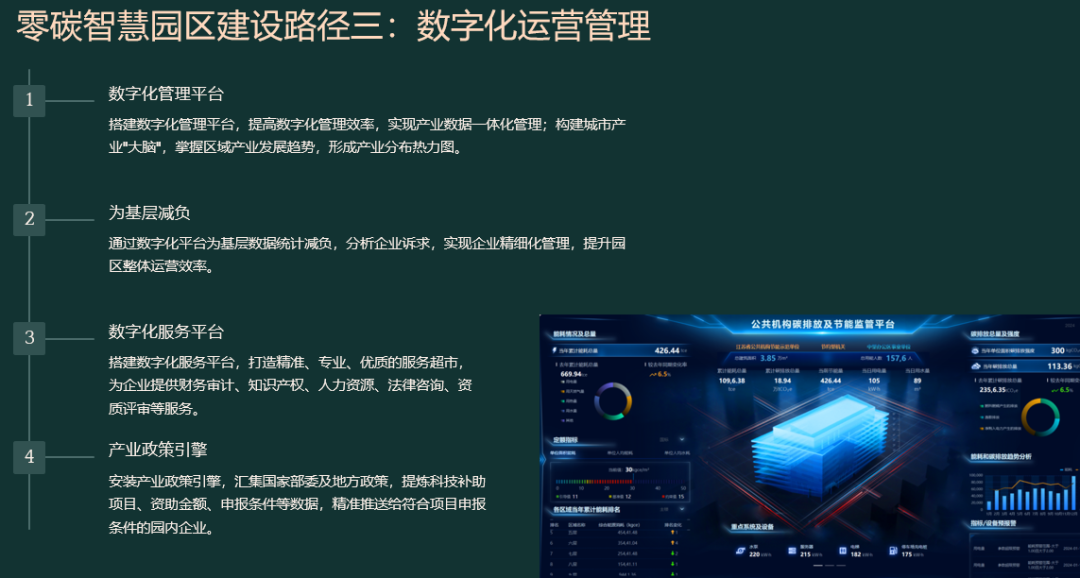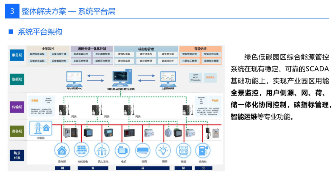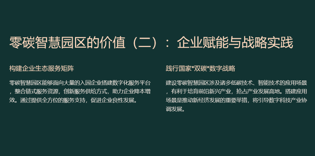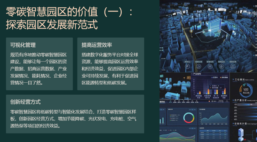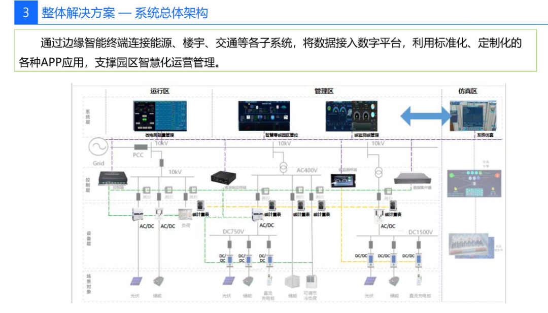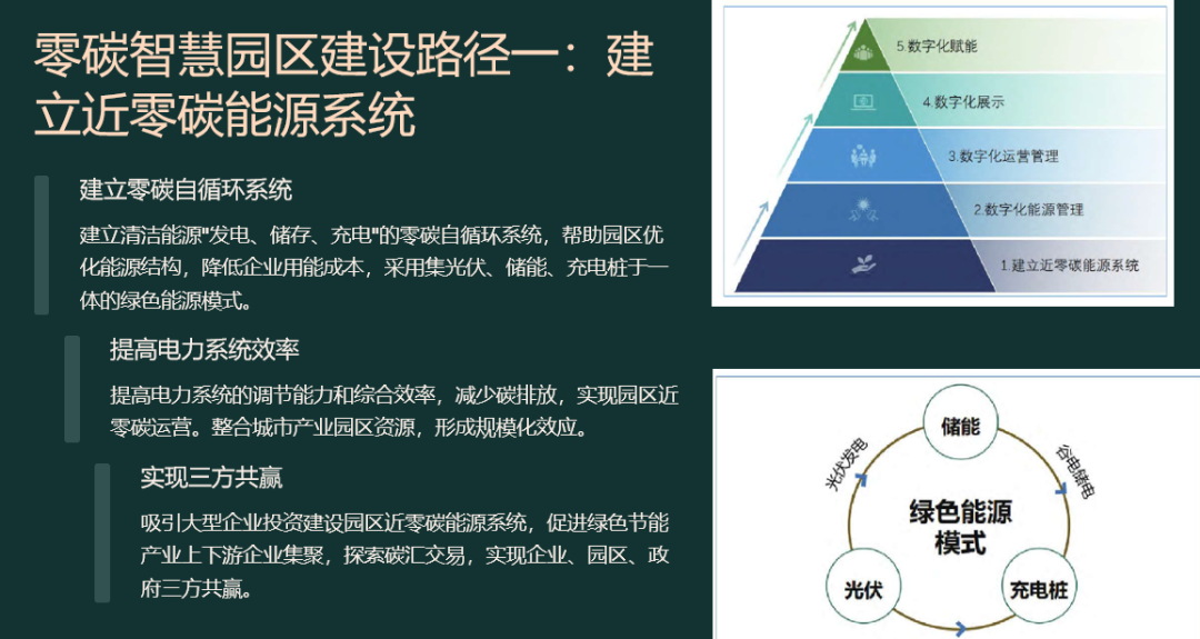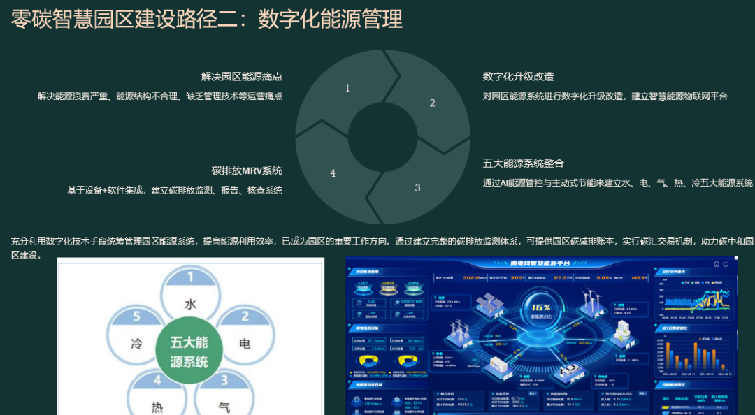 55页PPT|零碳智慧园区解决方案![]() ![]() ![]() ![]() ![]() 先“盘家底”再“定路线”。园区以碳排放核算为起点,建立覆盖范围一、二、三的实时“碳账户”,形成数字孪生底图;据此设定“碳达峰—碳中和”双时间轴目标,并与地方碳考核、碳交易规则对接,输出“1张蓝图+1套指标+1个平台”的总体框架,确保后续建设可量化、可考核、可融资。 ![]() ![]() ![]() ![]() ![]() ![]() ![]() ![]() ![]() ![]() 构建“源-网-荷-储-碳”五维协同。源侧以屋顶光伏、垂直风电、沼气热电联产为主,实现80%以上绿电就地生产;网侧部署交直流混合微电网,毫秒级保护确保离网/并网双模运行;荷侧推行BIPV建筑、LED智能照明、全电交通,并引入V2G车网互动,把电动汽车作为分布式储能;储侧按“光伏装机15%+2小时”配置锂电+超级电容,结合退役电池梯次利用,平滑峰谷并参与电力现货套利;碳侧布设1秒级刷新传感器,AI预测15分钟发电功率,自动生成减碳调度策略,实现年减排千吨以上。 ![]() ![]() ![]() ![]() ![]() ![]() ![]() 分“三步走”闭环落地。第一步建设期,政府提供“区域能评+碳评”打包审批、绿色债券与专项补贴,企业完成高耗能设备淘汰、零碳建筑和智慧能源大脑同步上线;第二步运营期,平台对14.6万个设备进行在线诊断,动态调节冷热电三联供与蓄能空调,持续降低能耗;第三步认证期,由第三方核查机构开展碳盘查与抵消,剩余排放通过绿证、碳汇或碳交易中和,获取中国质量认证中心或TÜV零碳证书,形成“建设—运营—交易—再投资”的可持续商业模式。 #来源:『数字智库分享』,本平台所载文章为本账号原创或根据网络搜索下载编辑整理,文章版权归原作者所有,仅供读者学习、参考,禁止用于商业用途。因转载众多,无法找到真正来源,如标错来源,或因文中所使用的图片、文字、链接等如有侵权,请联系我们删除,谢谢!